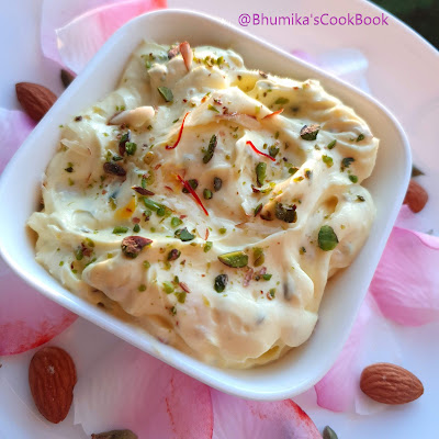 - Pour the Srikhand to a serving bowl and garnish with chopped pistachios and almonds and few saffron strands.